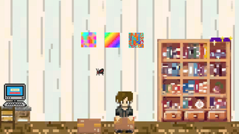Letter N: Use the cardboard boxes to jump to the posters on the wall. You may see, maybe with the help of switching into the bug mode to better differentiate the colors, that one of the posters looks like the letter "N". Grab it and place it on the computer.